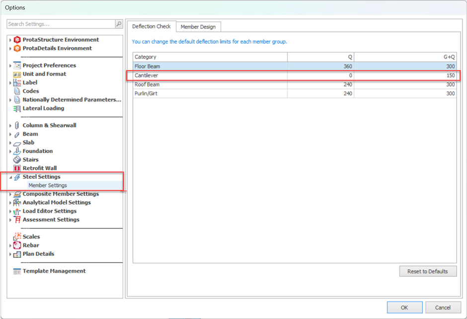 - For steel cantilever beams, this will ensure the design deflection limits is correct according to the chosen code. The deflection limits can be changed in the steel settings.