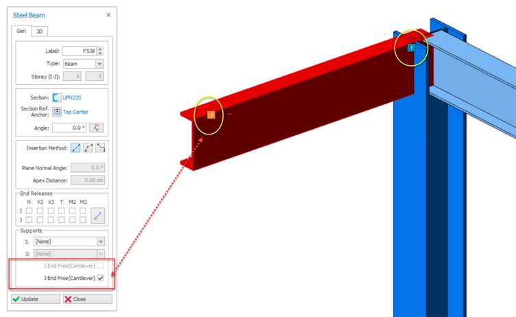 During the modelling process, whenever a beam is unsupported at one end, the program will automatically mark it as a cantilever.