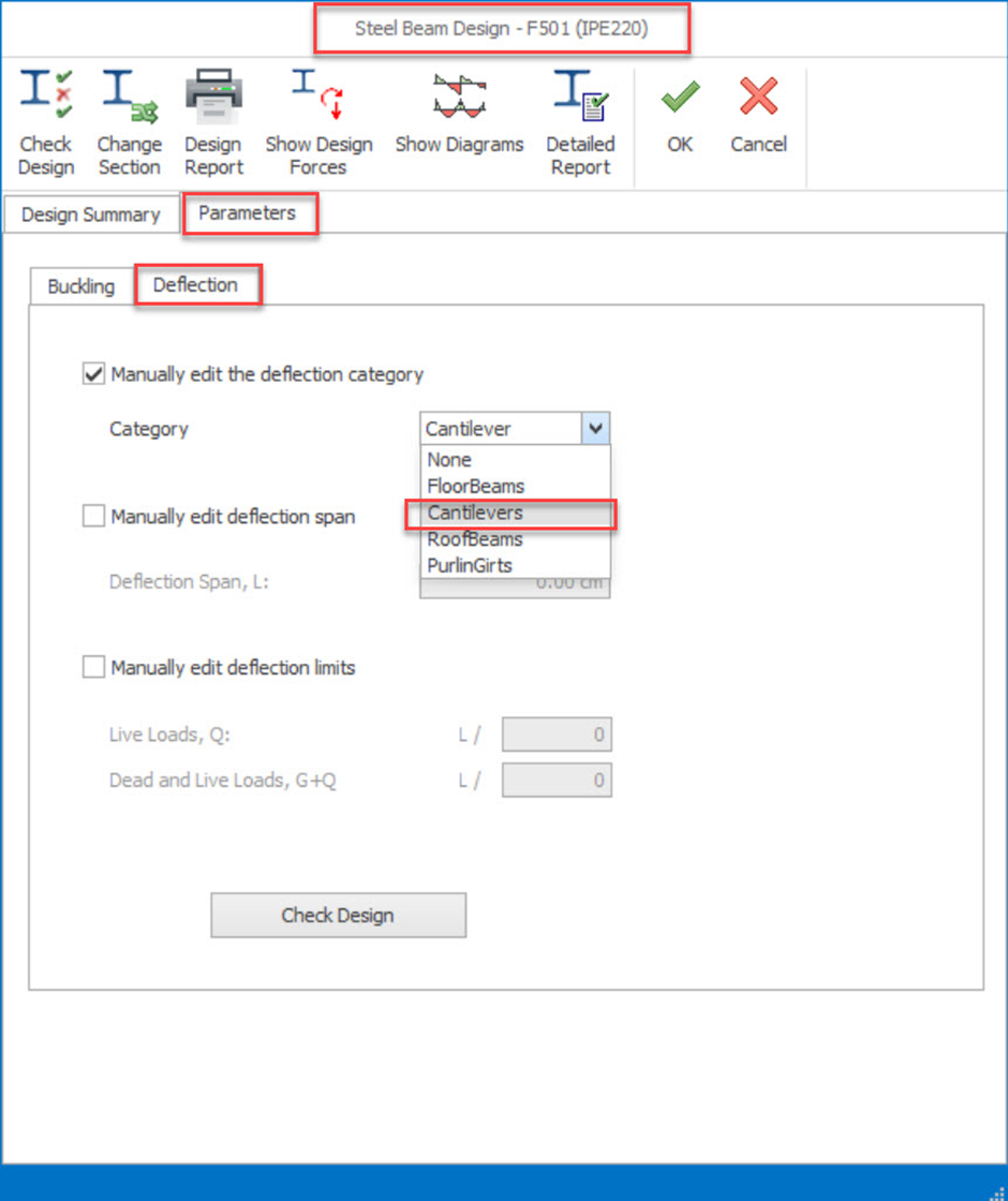 categories can also be manually reviewed or adjusted in the Parameters > Deflection in the steel beam design window.