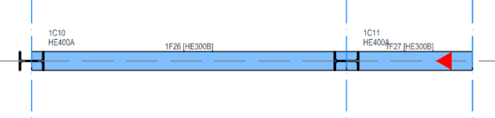 Similar to RC beams, cantilever steel beams is visualized in the 3D model and plan view using red triangle symbols. The element’s start