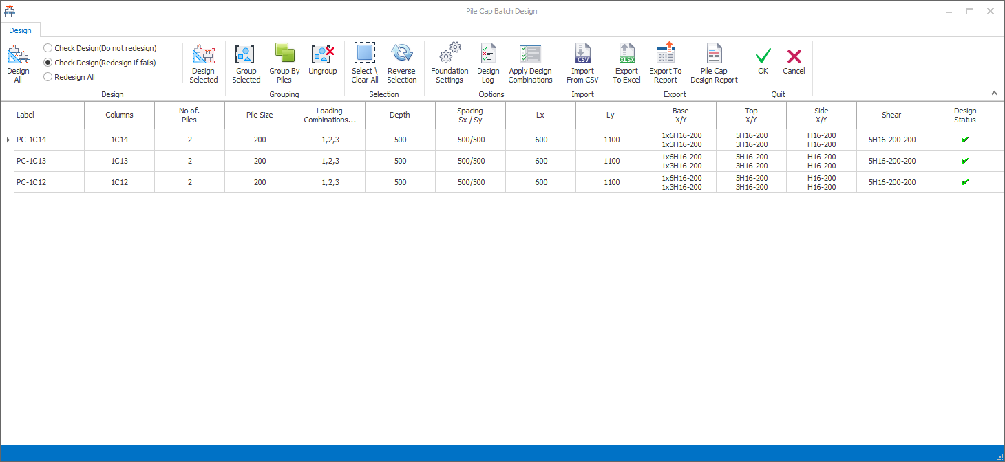However, the design is complex with many inter-related variables. Hence, when pile caps are indicated as failed, manually amending the pile cap parameters may be necessary to achieve a pass status.