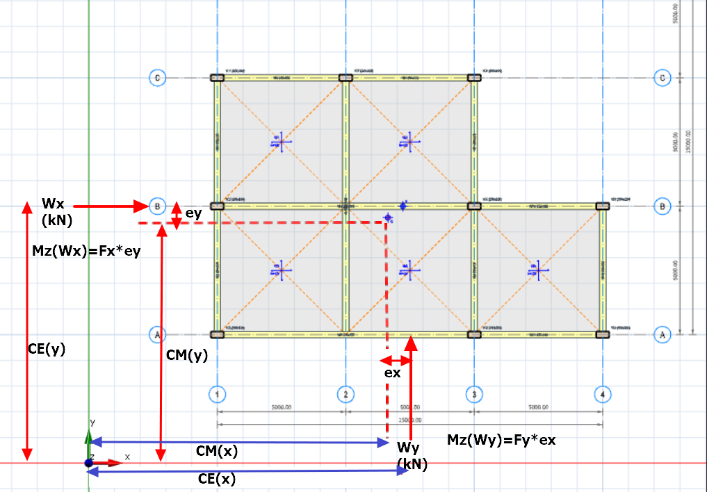 The wind loads, namely Wx and Wy are defined as point loads on each storey. The coordinates (X, Y) of the applied wind loads are measured from (0, 0) - NOT from the bottom left corner (axes intersection) of the model.